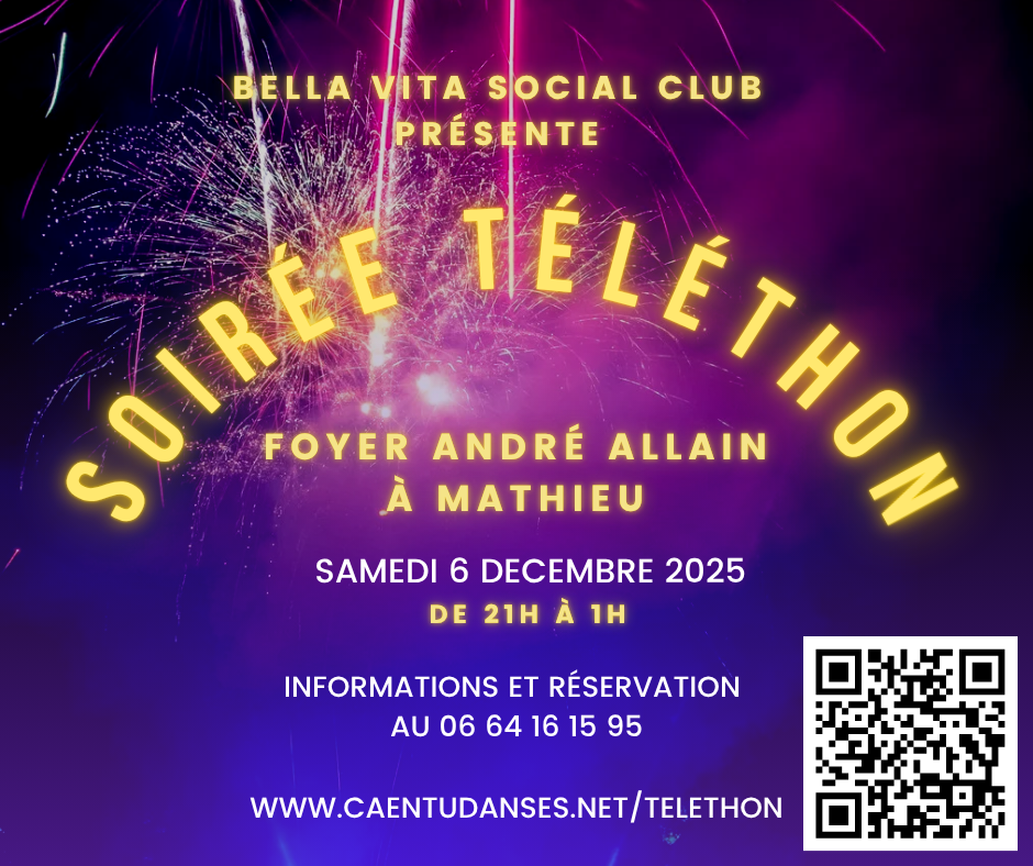 L'association Bella Vita Social Club organise sa 3ème soirée au profit du Téléthon au foyer André Allain à Mathieu, le samedi 6 décembre 2025 de 21h à 1h.